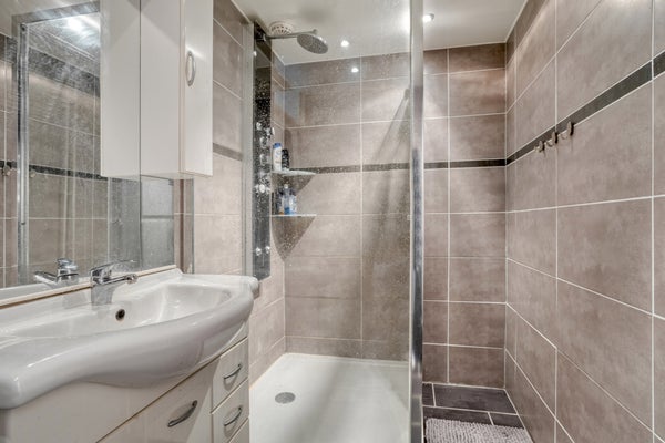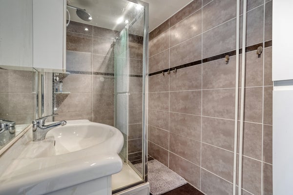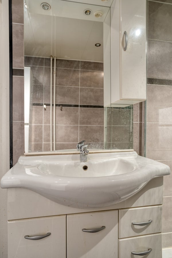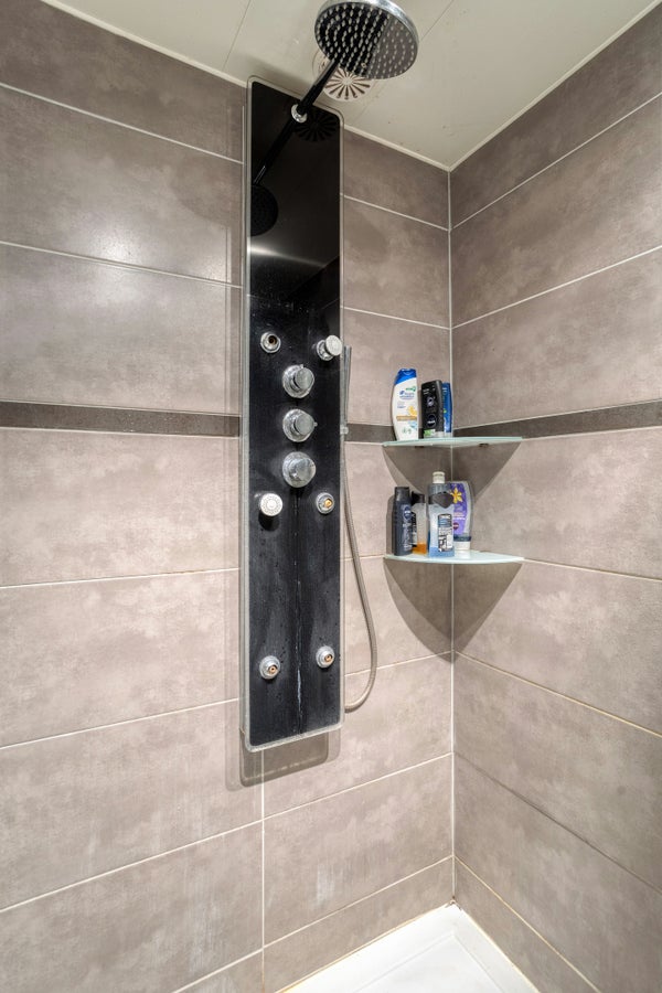 De badkamer is volledig betegeld en modern afgewerkt, wat zorgt voor een frisse en verzorgde uitstraling. U beschikt hier over een douchecabine met glazen wand en een wastafelmeubel. De ruimte is ruim opgezet en goed onderhouden, waardoor u hier in alle comfort uw dag kunt beginnen of afsluiten. Daarnaast is er een separate toiletruimte aanwezig, wat extra gemak biedt.