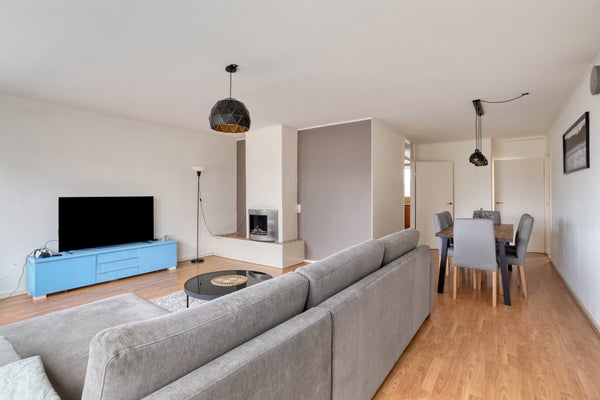 De ruime, open woonkamer wordt gekenmerkt door een aangename lichtinval die de ruimte een frisse en uitnodigende uitstraling geeft. Hier heeft u alle vrijheid om een comfortabele zithoek en een gezellige eethoek te creëren. De haard vormt de eyecatcher van de ruimte en zorgt voor extra sfeer tijdens de koudere maanden. Het is een plek waar u heerlijk kunt ontspannen of gasten kunt ontvangen.