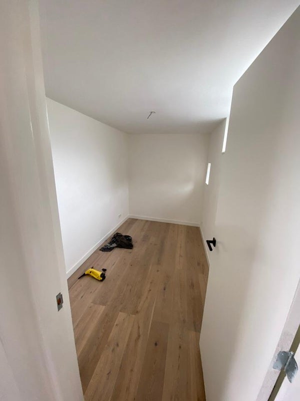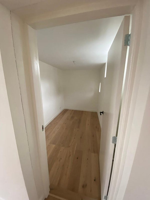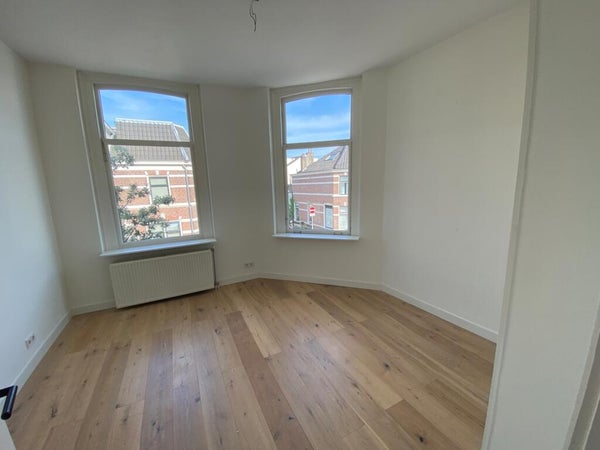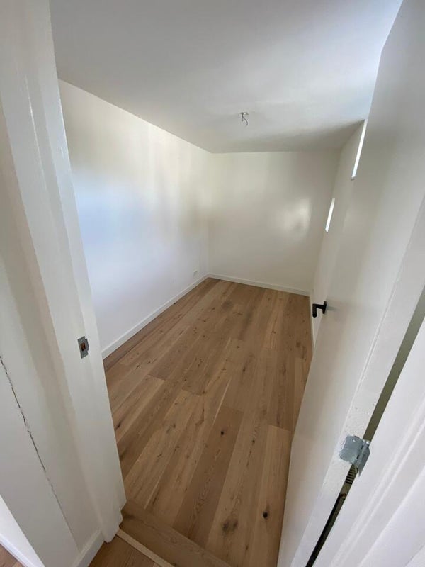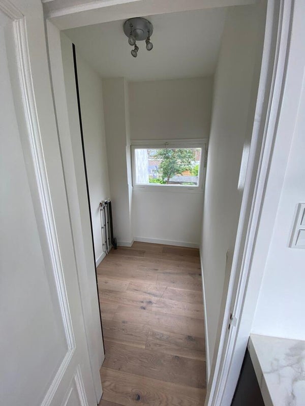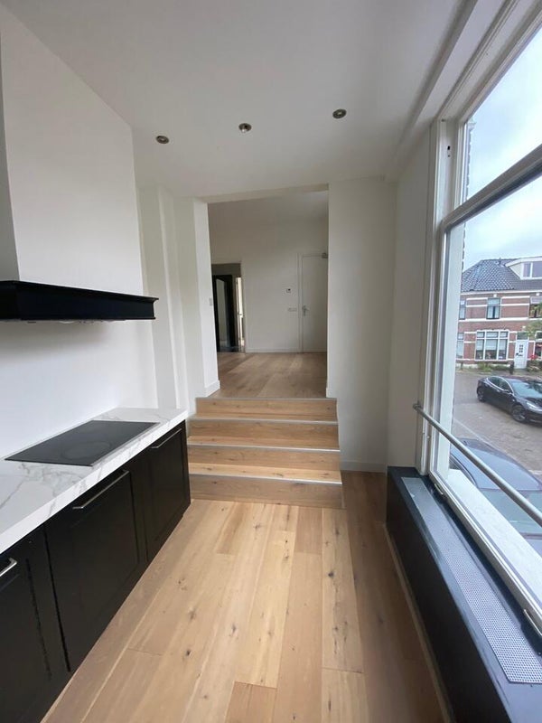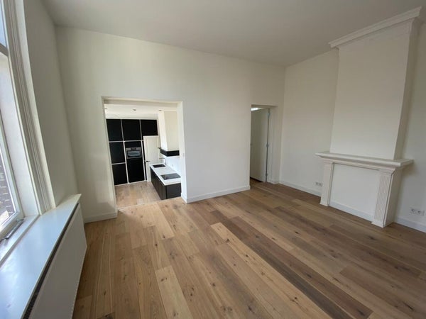 Als je binnenkomt, kom je in de woonkamer. Aan de rechterzijde is de deur naar de badkamer met aangrenzend de slaapkamer aan de zijkant die prachtige mooie hoge ramen heeft.