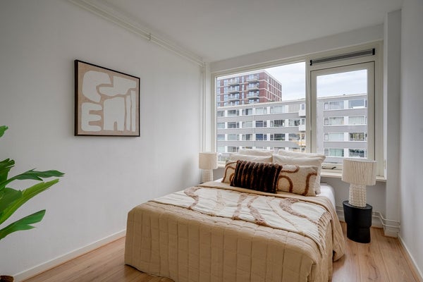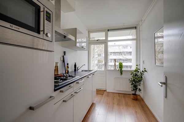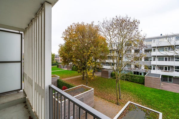 De hal geeft toegang tot alle vertrekken, waardoor de indeling overzichtelijk en efficiënt is. De doorzonwoonkamer zorgt voor een fijne hoeveelheid daglicht en biedt volop ruimte om naar eigen smaak in te inrichten. Het appartement is gelegen op de hoek, waardoor het meer daglicht heeft en een balkon aan de zijkant van de woning. De aparte keuken is uitgerust met diverse inbouwapparatuur en geeft toegang tot het balkon aan de achterzijde. Er zijn twee slaapkamers. De badkamer is netjes afgewerkt en voorzien van een inloopdouche, wastafel en toilet, met een raam voor natuurlijke ventilatie. Dit appartement heeft zonnepanelen op het dak.