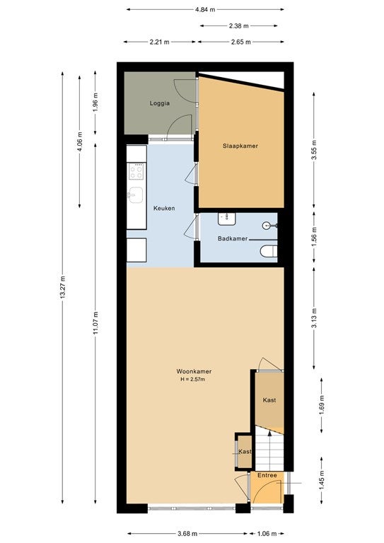 - De benedenwoning heeft een woonoppervlakte van 58 m² en beschikt over 2 kamers, waarvan 1 slaapkamer;