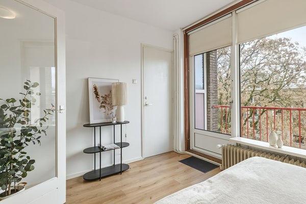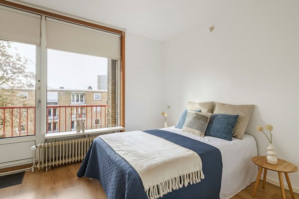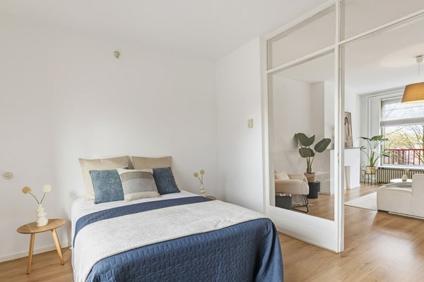 Het appartement beschikt over twee slaapkamers. De master bedroom heeft directe toegang tot het balkon aan de oostzijde. De tweede slaapkamer is geschikt als werkruimte, logeerkamer of kinderkamer.