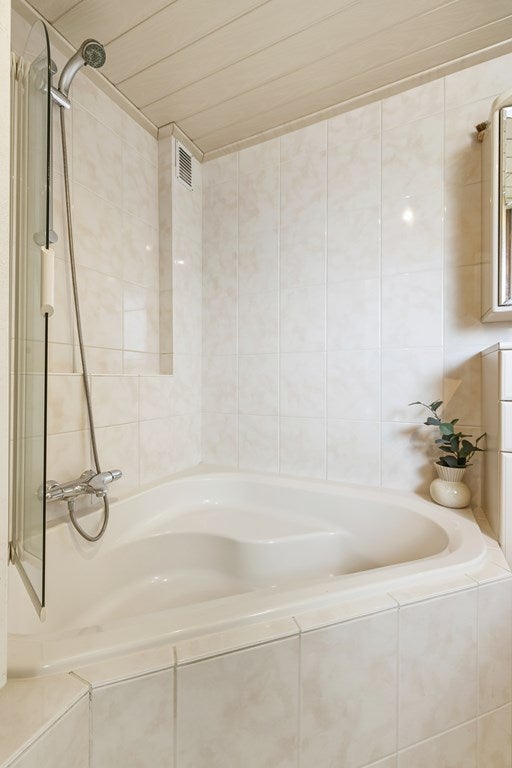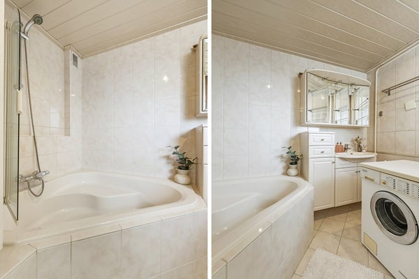 De badkamer is voorzien van een groot ligbad waarin ook gedoucht kan worden en een wastafel.