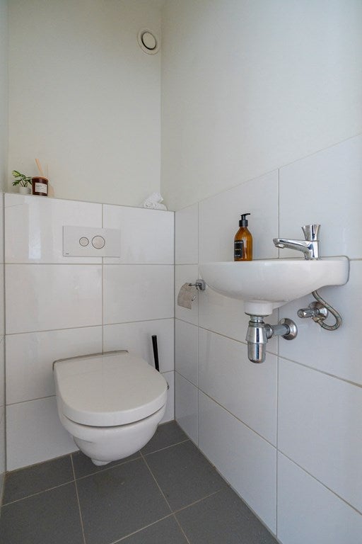 De badkamer ligt centraal in de woning en is voorzien van een inloopdouche en wastafel. Daarnaast is er een separaat toilet met fontein