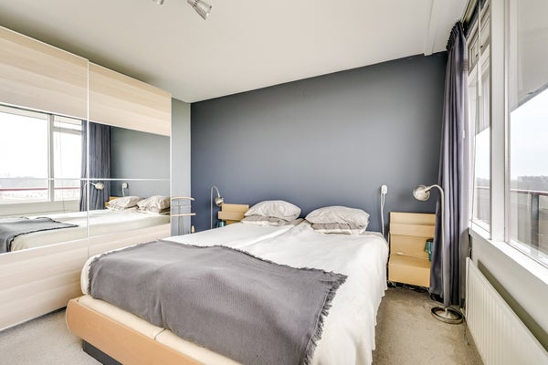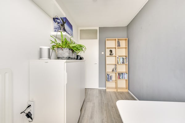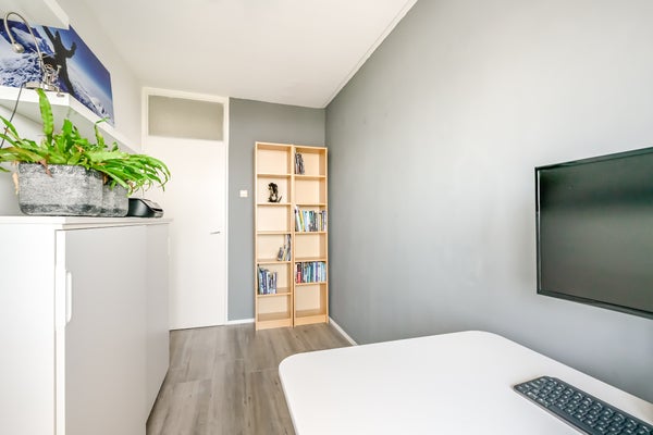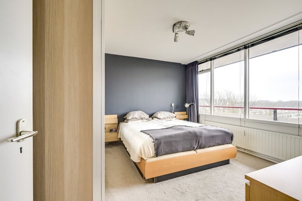 De slaapkamers aan de balkonzijde, in gebruik als berging en werkkamer, zijn beiden circa 7.8 m2. Rustige kleuren bepalen de sfeer en er ligt, net als in de hal en keuken, laminaat op de vloer. De master bedroom van ruim 15 m2, met zacht tapijt op de vloer, is aan de andere kant van het appartement. Naast een groot tweepersoonsbed is er genoeg plek om een grote garderobekast neer te zetten.