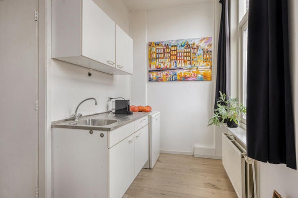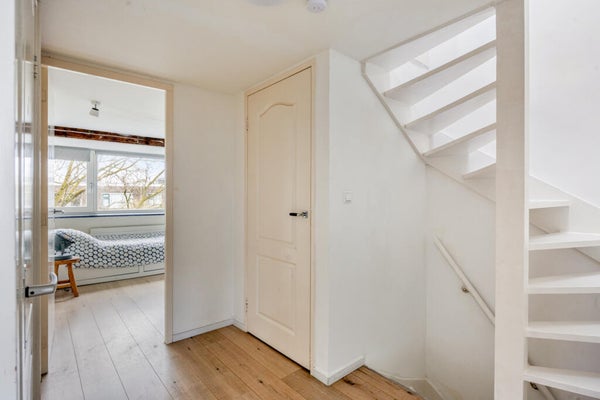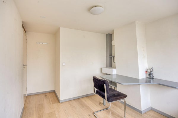 Ruime overloop met toegang tot de woonkamer, een slaap-/werkkamer, het toilet en de keuken. Deze verdieping is licht en ruim opgezet en biedt veel flexibiliteit in indeling. De keuken is aan de achterzijde gesitueerd en eenvoudig uitgevoerd, waardoor modernisering geheel naar eigen smaak mogelijk is.