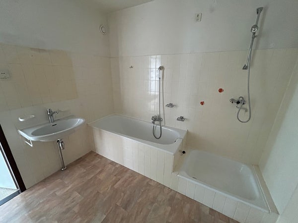 Badkamer 2,70 x 2,55 met novilon, ligbad, douche, wastafel en aansluitingen was-apparatuur.