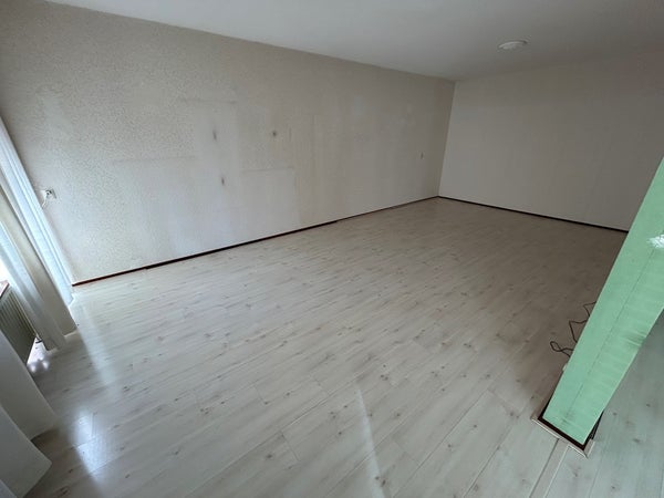 Woonkamer 6,20 x 5,50 met laminaatvloer, open keuken, doorgang naar slaapkamer en deur naar portaal.