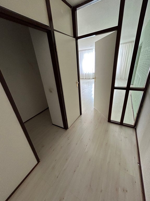 Portaal 1,60 x 0,90 met vloerbedekking, bergkast, deur naar toilet, badkamer en slaapkamer.