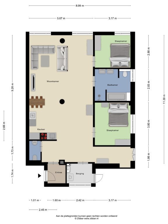 - De portiekflat heeft een woonoppervlakte van 110 m² en beschikt over 3 kamers, waarvan 2 slaapkamers;