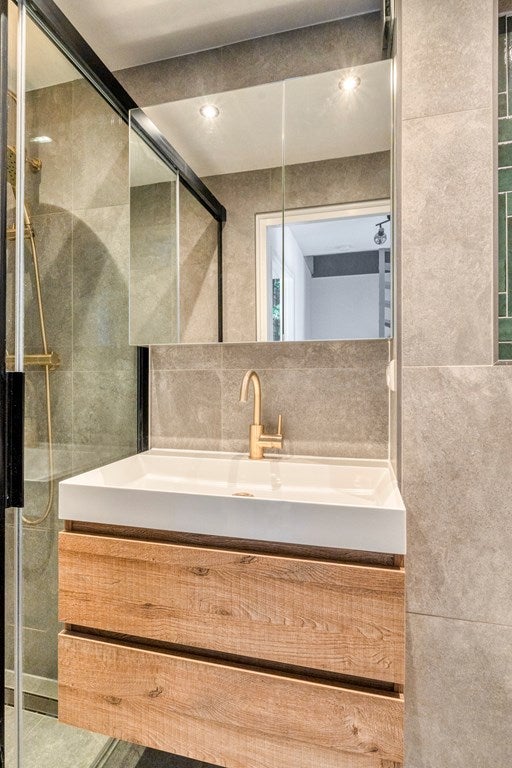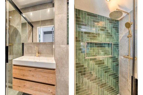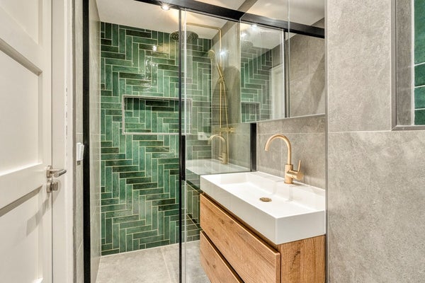 De recent vernieuwde badkamer is modern en stijlvol ingericht met een inloopdouche voorzien van regendouche, hangend toilet, houten wastafelmeubel met waskom en goudkleurige kraan, designradiator en mechanische ventilatie. De combinatie van groene en grote grijze tegels geeft de ruimte een luxe uitstraling.