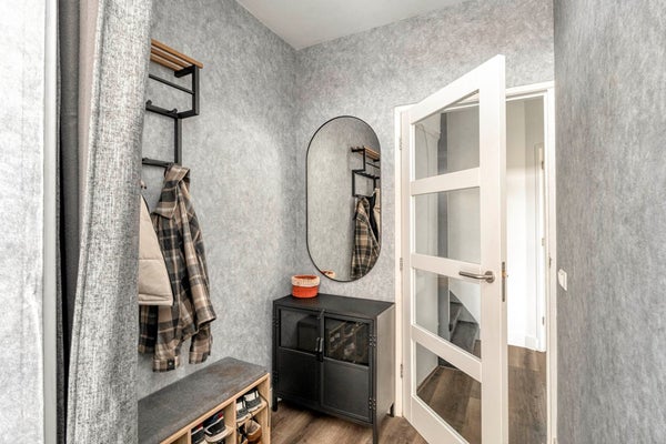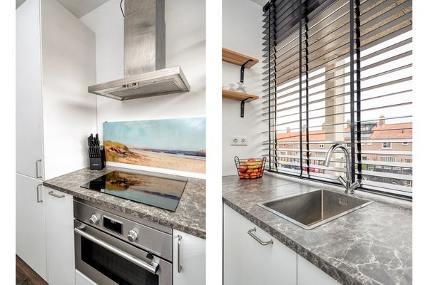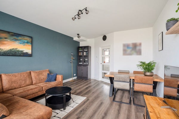 Via de voordeur bereikt u de hal met meterkast en toegang tot de rest van het appartement. De brede laminaatvloer loopt door in de woonkamer en keuken en geeft een rustige, samenhangende uitstraling. De houten kozijnen zijn voorzien van dubbelglas en Luxaflex. In 2020 is de elektra vernieuwd en zijn de stopcontacten praktisch laag geplaatst. Grote raampartijen zorgen voor veel lichtinval en een open gevoel met uitzicht op water en groen.