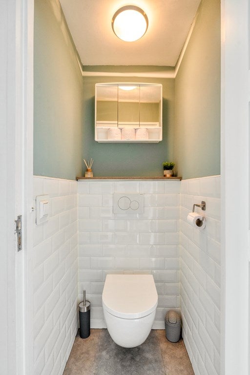 Het toilet is uitgevoerd in een frisse, lichte kleurstelling, tot 1,5 meter betegeld en voorzien van een modern hangend toilet. Netjes afgewerkt en praktisch in gebruik.