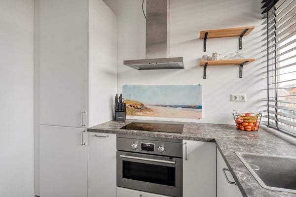 De keuken is uitgevoerd met witte kasten en een grijs werkblad en beschikt over diverse inbouwapparatuur, waaronder een inductiekookplaat met afzuigkap, koelkast met vriezer, combimagnetron en een Inventum vaatwasser. Verwarming is aanwezig, wat het comfort compleet maakt.