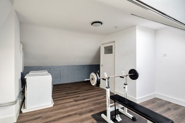 De zolder is eveneens afgewerkt met doorlopend laminaat en biedt extra leef- of werkruimte. Twee Velux dakramen met rolgordijnen zorgen voor lichtinval, terwijl vier knieschotten praktische bergruimte bieden. Hier bevinden zich de cv-ketel uit 2020 en de aansluiting voor de wasmachine.