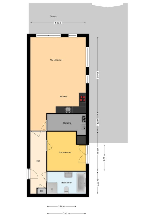 - De galerijflat heeft een woonoppervlakte van 71 m² en beschikt over 2 kamers, waarvan 1 slaapkamer;