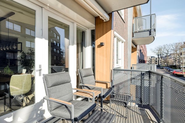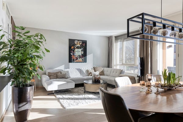 Ruime woonkamer met veel natuurlijk lichtinval dankzij de grote raampartijen. Voorzien van een smaakvolle vloer en stucwerk wanden. Middels dubbele openslaande deuren toegang tot het ruime balkon aan de voorzijde.