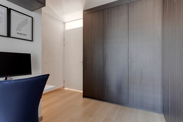 Tweede slaap-/werkkamer met smaakvolle vloer en maatwerk inbouwkastenwand.
