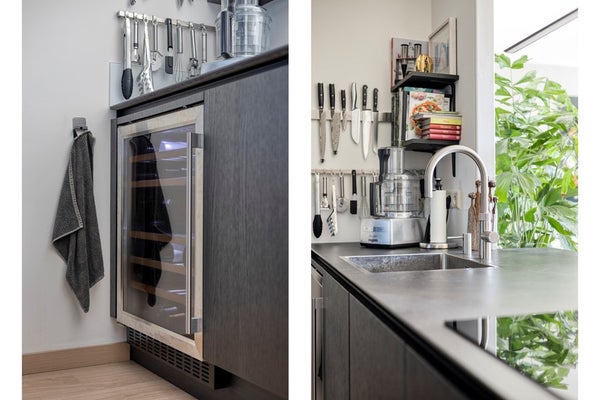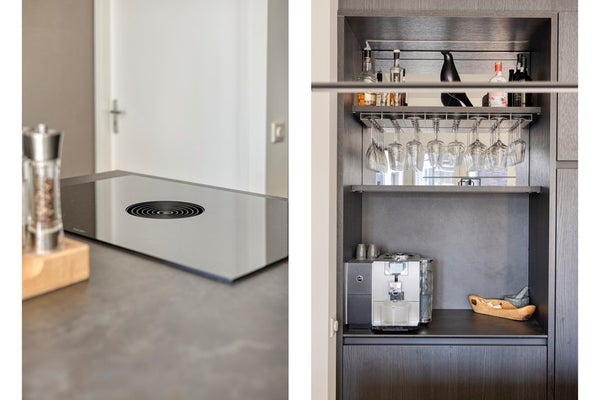 De absolute blikvanger is de high-end keuken met schitterend kookeiland en keramiek werkblad/bar. Royale kastenwand met smaakvolle nis met indirecte verlichting. De keuken is uitgerust met alle wenselijke inbouwapparatuur zoals inductie kookplaat met geïntegreerde afzuiging, combi-oven, vaatwasser, grote koelkast, wijnklimaatkast en quooker.