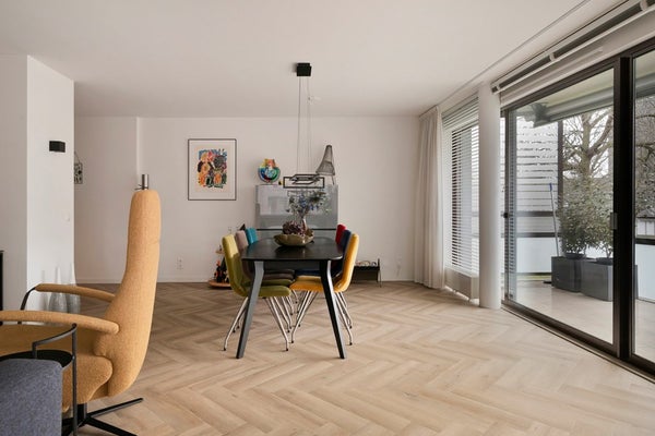 Binnenkomst in woonkamer met veel lichtinval en een half-open keuken. De woonkamer is voorzien van een airco (2025) en heeft een mooi groen uitzicht over het park. Op het zuidwesten gelegen ruim balkon met elektrische zonneluifel.
