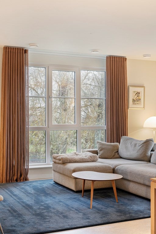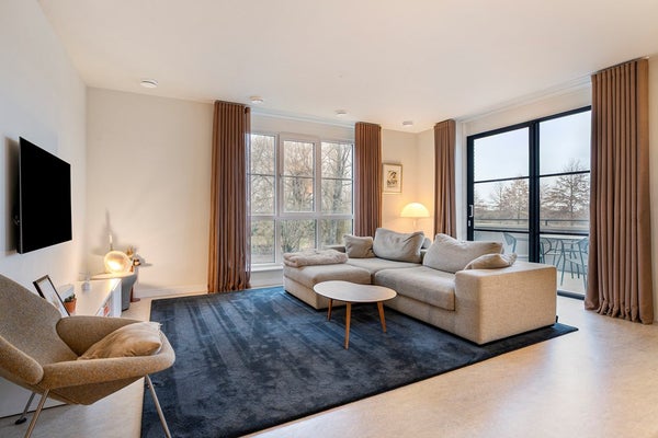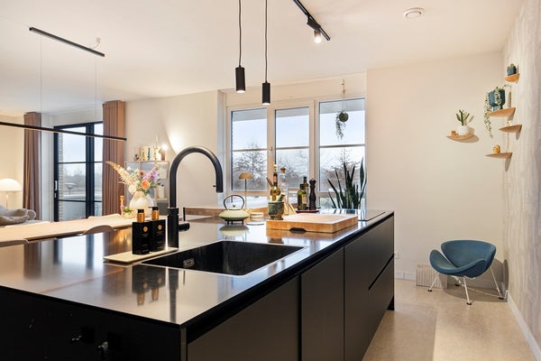 The spacious and bright living room forms the heart of the apartment. High windows and a sliding door create an open and airy ambiance and provide access to the generous balcony of approximately 10 m², offering peaceful, unobstructed views of the water and surrounding countryside. The open kitchen is designed in a modern, low-maintenance style, featuring a cooking and cleaning island and sleek cabinetry. It is finished with a granite countertop, giving the kitchen a luxurious and timeless look. The kitchen is fully equipped with high-quality appliances, including an induction cooktop, dishwasher, refrigerator, combination oven, and Quooker, providing optimal comfort for daily use and entertaining guests.