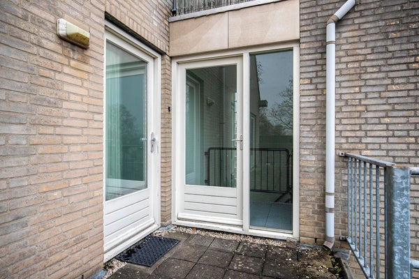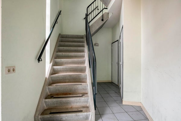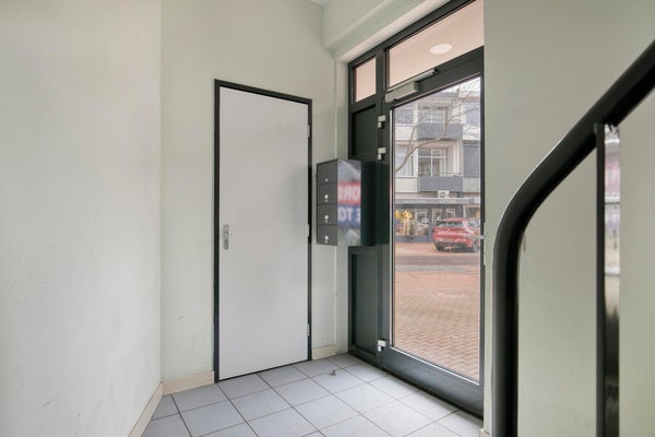 Gemeenschappelijke entree met brievenbussen, bellentableau en trapopgang. De privéberging is gelegen aan de achterzijde van het complex.