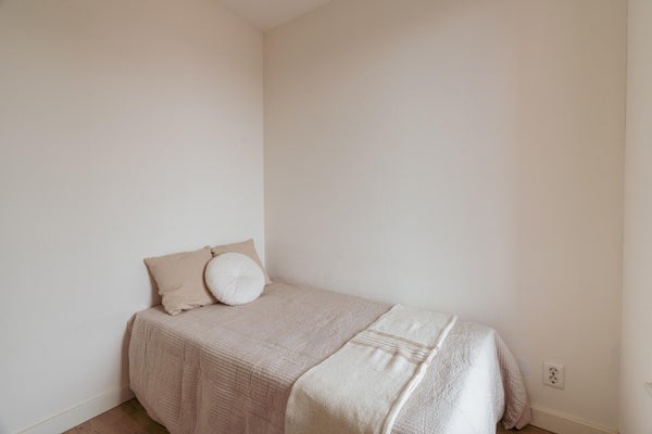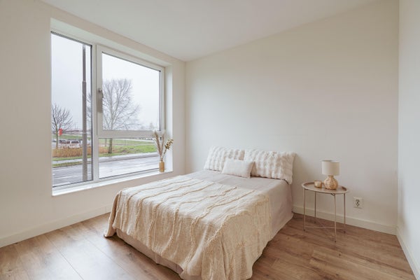 Het appartement heeft twee slaapkamers, waarvan de hoofdslaapkamer aan de rustige zijde ligt. De tweede kamer is ideaal als werkkamer of logeerkamer. De badkamer is modern uitgevoerd met inloopdouche, wastafelmeubel en wasmachineaansluiting. Er is een separaat toilet in de hal.