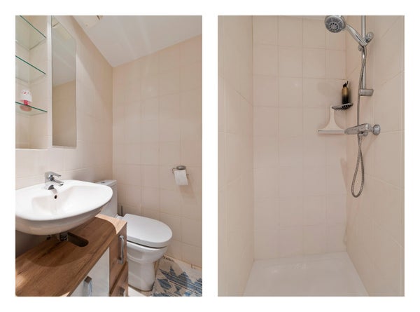 • Badkamer: De volledig betegelde badkamer beschikt over een douche, wastafel en toilet.