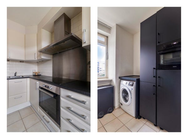 • Keuken: De dichte keuken is voorzien van een tegelvloer en een compleet keukenblok met diverse inbouwapparatuur, waaronder een vaatwasser, oven, koelkast, diepvries, inductie kookplaat en afzuigkap.