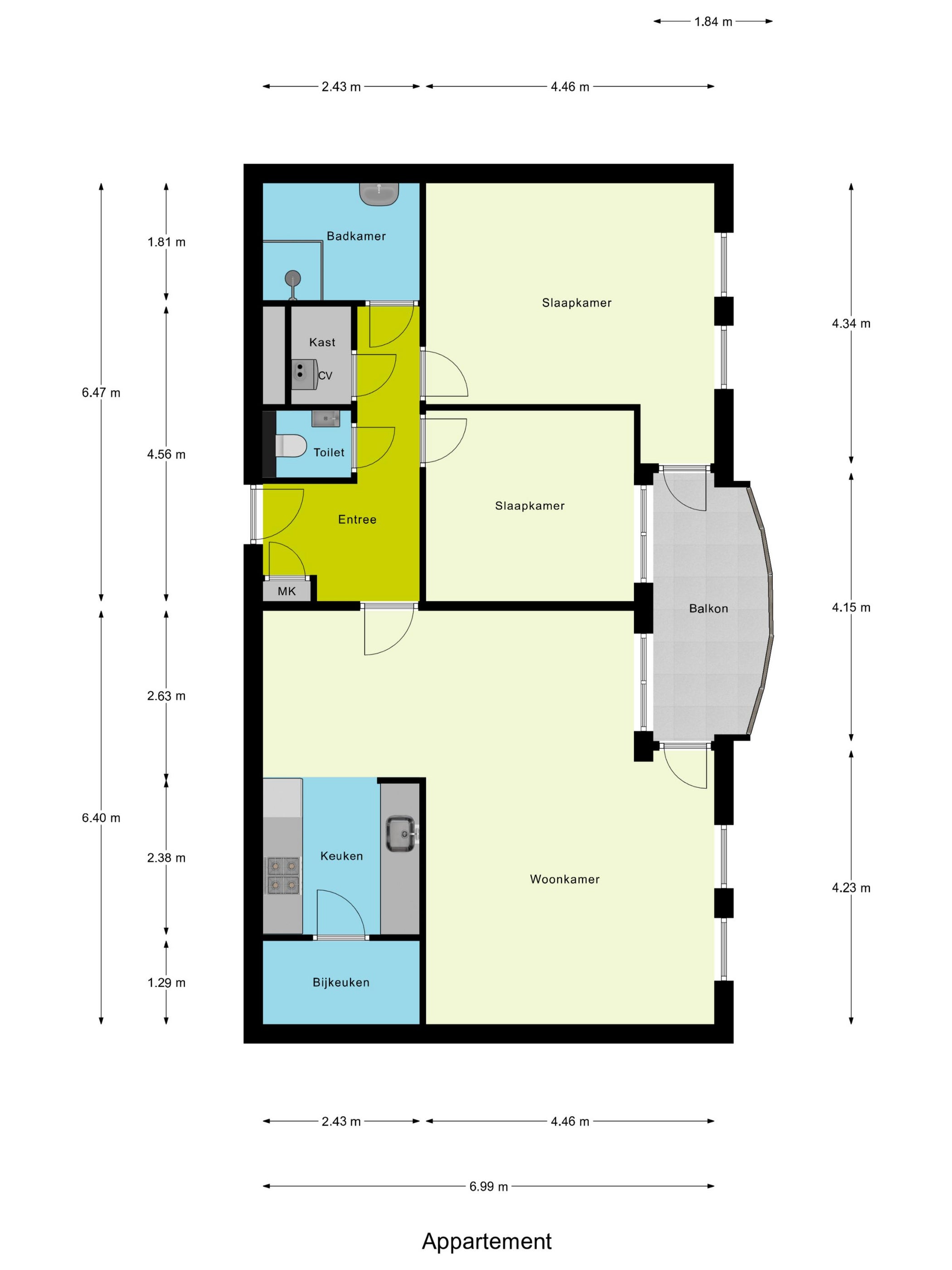 - De galerijflat heeft een woonoppervlakte van 85 m² en beschikt over 3 kamers, waarvan 2 slaapkamers;