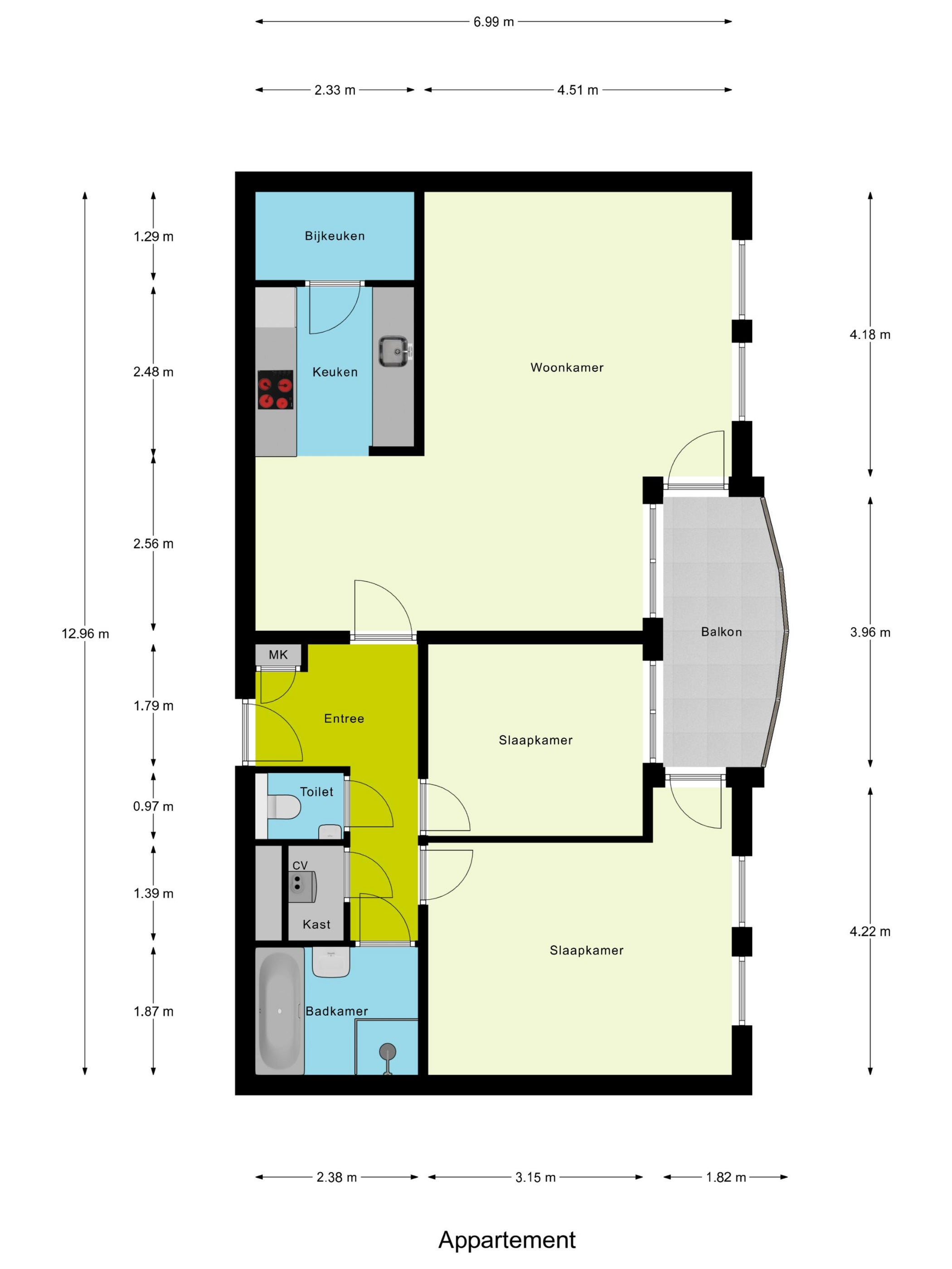 - De galerijflat heeft een woonoppervlakte van 84 m² en beschikt over 3 kamers, waarvan 2 slaapkamers;