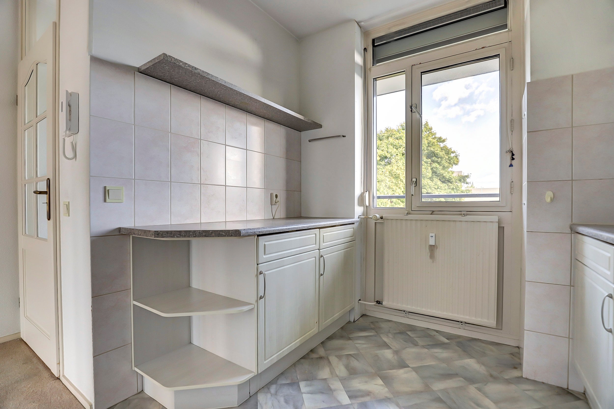 Dit 3-kamer appartement van 76 m² met een inhoud van 215 m³ is gelegen in het centrum van Blerick, met uitzicht over de Witherenstraat. Het appartement bevindt zich op de tweede verdieping van een gebouw uit 1974 en heeft een centrale entree op de begane grond, die toegang biedt tot de bergingen en de lift. Bij binnenkomst in het appartement tref je een hal aan die leidt naar een gesloten keuken met een 4-pits gasfornuis en een praktische bijkeuken met aansluiting voor een wasmachine. De woonkamer van ongeveer 30 m² heeft toegang tot een balkon met een zonnescherm. Twee slaapkamers van elk ongeveer 12 m², een apart toilet en een volledig betegelde badkamer met douche en wastafel completeren de indeling. Parkeren kan op het achterterrein. Servicekosten bedragen circa € 305,- per maand.