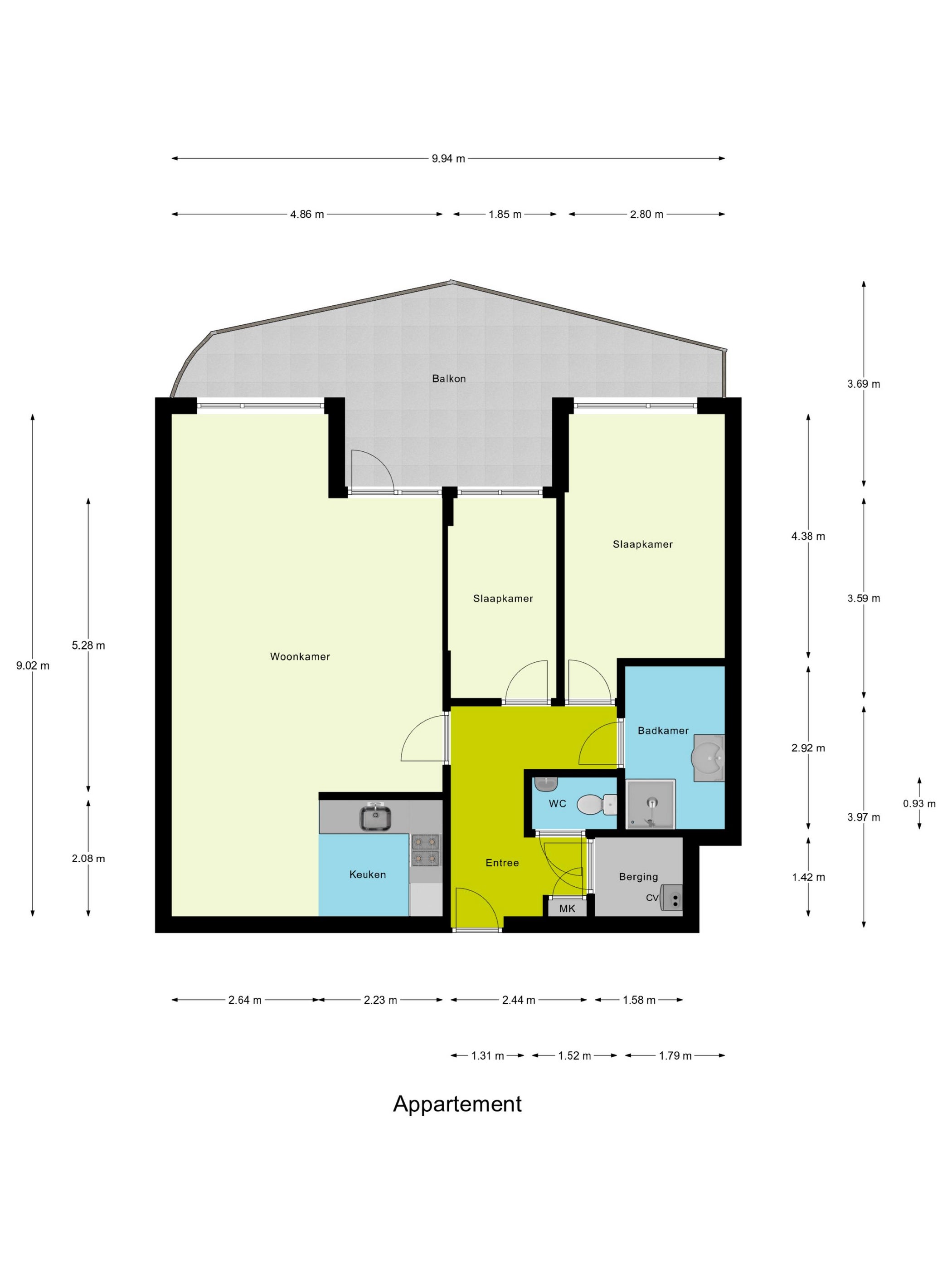 - De galerijflat heeft een woonoppervlakte van 82 m² en beschikt over 3 kamers, waarvan 2 slaapkamers;