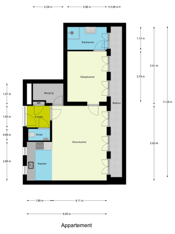 - De galerijflat heeft een woonoppervlakte van 56 m² en beschikt over 2 kamers, waarvan 1 slaapkamer;