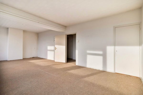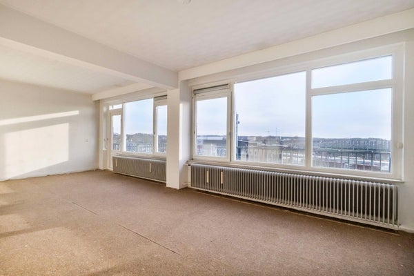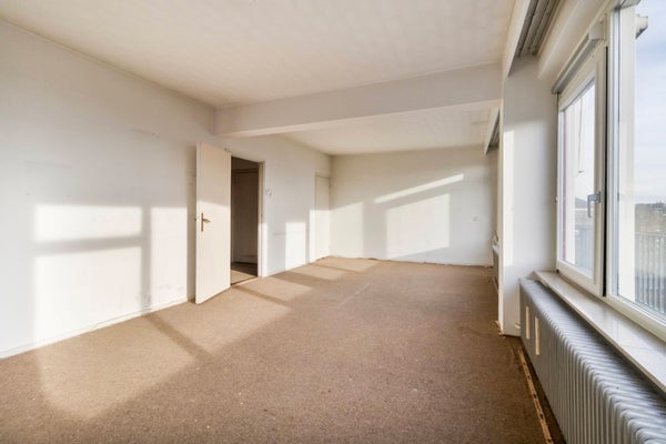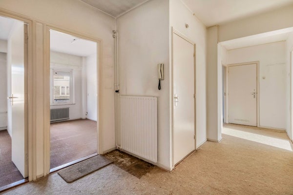 Via de royale entree/hal (ca. 12,5 m²) zijn alle vertrekken bereikbaar. De lichte en ruime woonkamer (ca. 30 m²) is voorzien van grote raampartijen en biedt toegang tot een ruim balkon van ca. 9 m². De dichte keuken (ca. 8,5 m²) beschikt over een eenvoudig keukenblok, witgoedaansluitingen en veel praktische opbergruimte. Het appartement telt drie slaapkamers van ca. 13 m², 8 m² en 8 m², allen voorzien van handige inbouwkasten. Vanuit de keuken en de grootste slaapkamer is een tweede, breed balkon van ca. 8,5 m² bereikbaar. Verder is er een badkamer met douche en vaste wastafel en een separate toiletruimte met fontein.