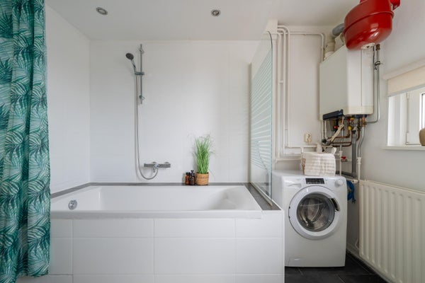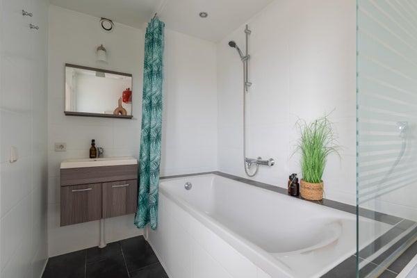 Vanuit de keuken is de badkamer bereikbaar. Deze is grotendeels betegeld en voorzien van een ligbad met douche, een wastafel met wastafelmeubel, de wasmachineaansluiting en de cv-ketel (2021, eigendom).