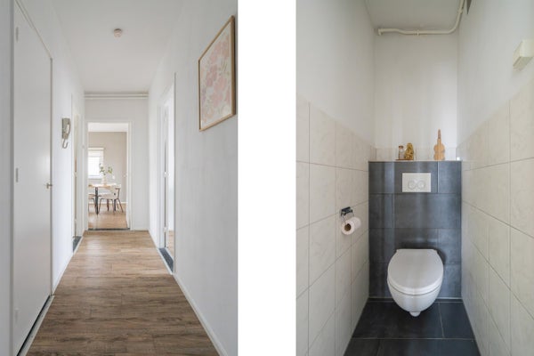 De ontvangsthal met PVC vloer biedt toegang tot de woonkamer, de keuken, twee slaapkamers, het toilet en de meterkast.