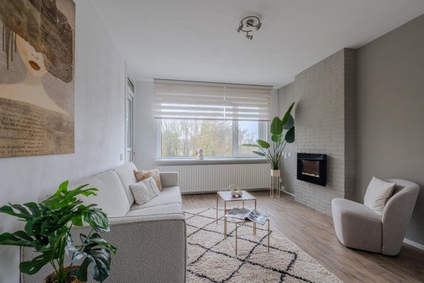 In de woonkamer ligt eveneens een PVC vloer. De grote raampartij zorgt voor veel natuurlijke lichtinval.