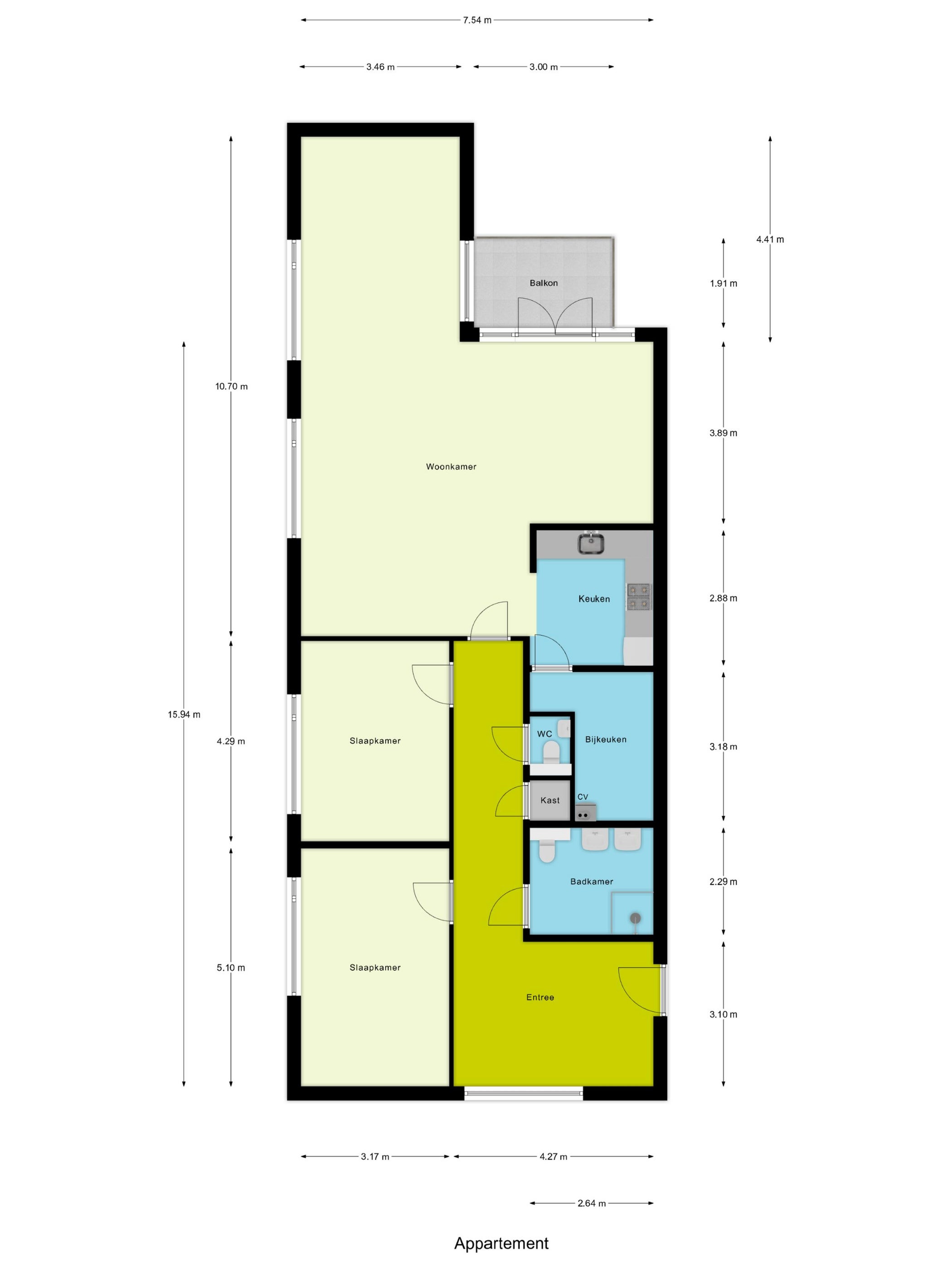 - De galerijflat heeft een woonoppervlakte van 135 m² en beschikt over 3 kamers, waarvan 2 slaapkamers;