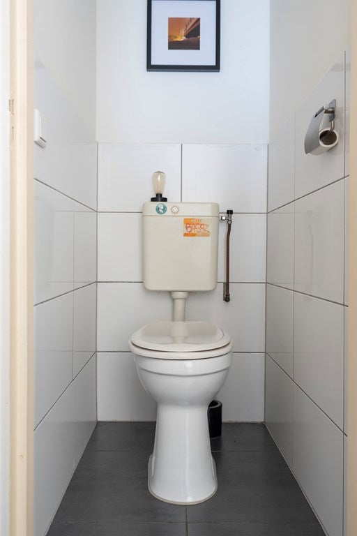 Het separate toilet is in dezelfde stijl betegeld en voorzien van een fonteintje.