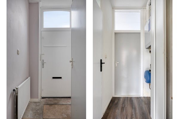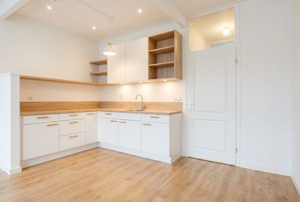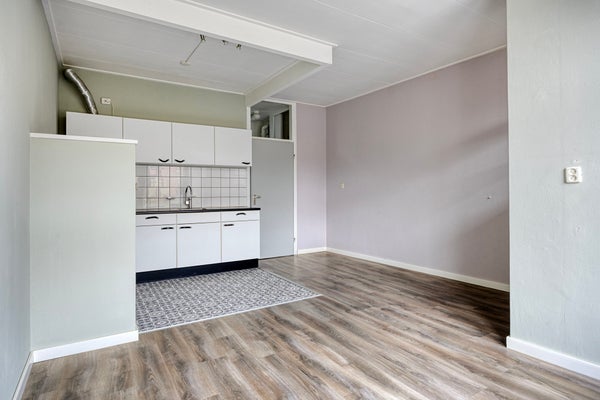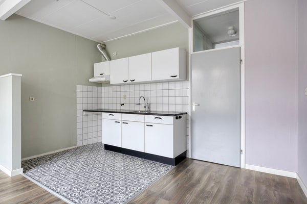 Eigen entree met meterkast en toegang tot de lichte woonkamer met open keuken. De keuken is voorzien van een eenvoudig recht keukenblok.