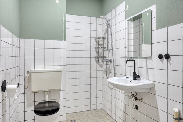 Centraal in de woning ligt de eenvoudige doch nette badkamer met douche, wastafel, toilet en aansluiting voor witgoed.