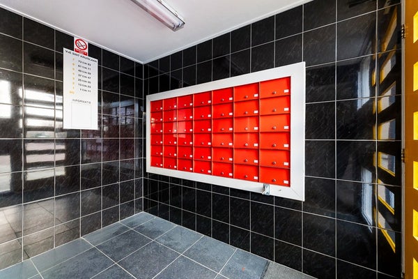 Afgesloten entree met de postbussen, het trappenhuis en de lift.