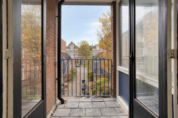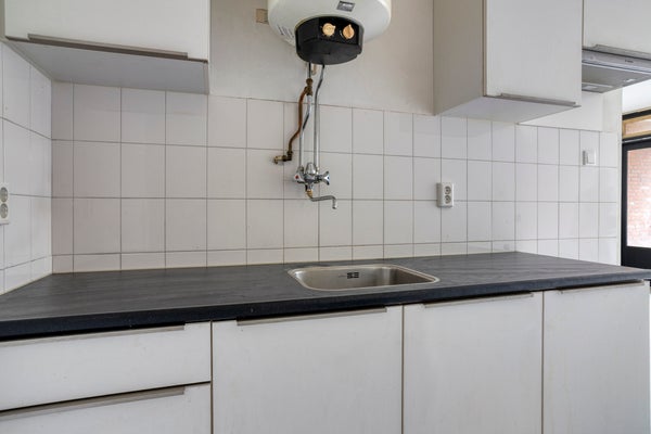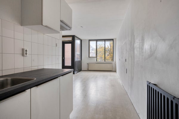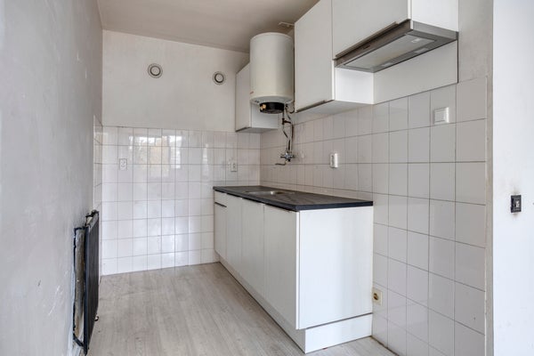 Appartement (eerste verdieping): Entree, gang met toegang tot alle vertrekken. De woonkamer is ruim en licht. Vanaf het balkon heb je uitzicht over het binnenhofje en de straat aan de voorzijde. De open keuken beschikt over een eenvoudig keukenblok met gootsteen en boiler.