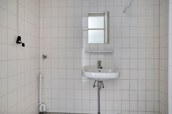 De badkamer beschikt over een douche, wastafel en aansluitingen voor de wasapparatuur.