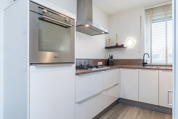 De moderne open keuken (2,92 m x 2,08 m) is v.v. navolgende apparatuur: 5 pits gaskookplaat, rvs afzuigkap, vaatwasser (2025), oven en koelkast (2025). Vanuit de keuken te bereiken bijkeuken alwaar standplaats CV- installatie (Remeha Avanta, 2012, eigendom) en aansluitingen wasapparatuur.