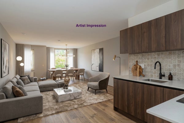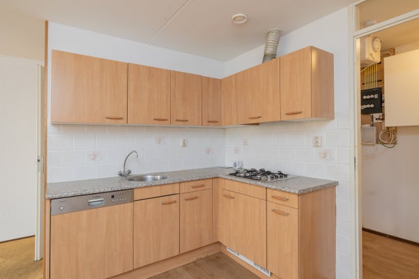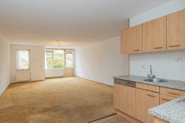Bij binnenkomst valt direct de gunstige indeling op. De lichte woonkamer met open keuken is gesitueerd aan de voorzijde van het appartement. Dankzij de grote ramen komt er veel daglicht binnen, wat zorgt voor een aangename en huiselijke sfeer. De open keuken vormt het hart van de leefruimte – praktisch ingericht en met voldoende kastruimte.