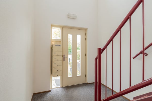 Centrale hal, brievenbussen, bellentableau, lift en trappenhuis. de garage en de gemeenschappelijke fietsenberging is achter het complex gelegen.