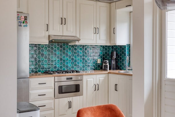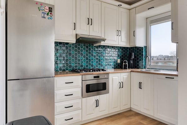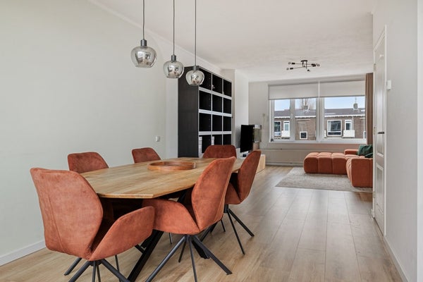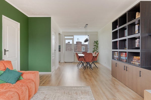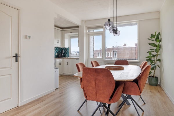 De royale woonkamer met aangrenzende eetkamer van ruim 9m lang (voorheen separate kamer) biedt een prettige, open leefruimte met grote raampartijen die zorgen voor veel natuurlijk licht. Vanuit de eetkamer heeft u toegang tot het balkon – een fijne plek om in alle rust van de ochtendzon of een goed glas wijn aan het einde van de dag te genieten. De keuken is voorzien van diverse inbouwapparatuur en centraal gelegen in het appartement, met directe verbinding naar de eetruimte en woonkamer.