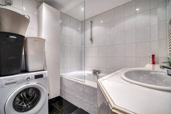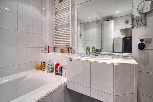 De badkamer beschikt o.a. over een ligbad, een wastafelmeubel en een designradiator.